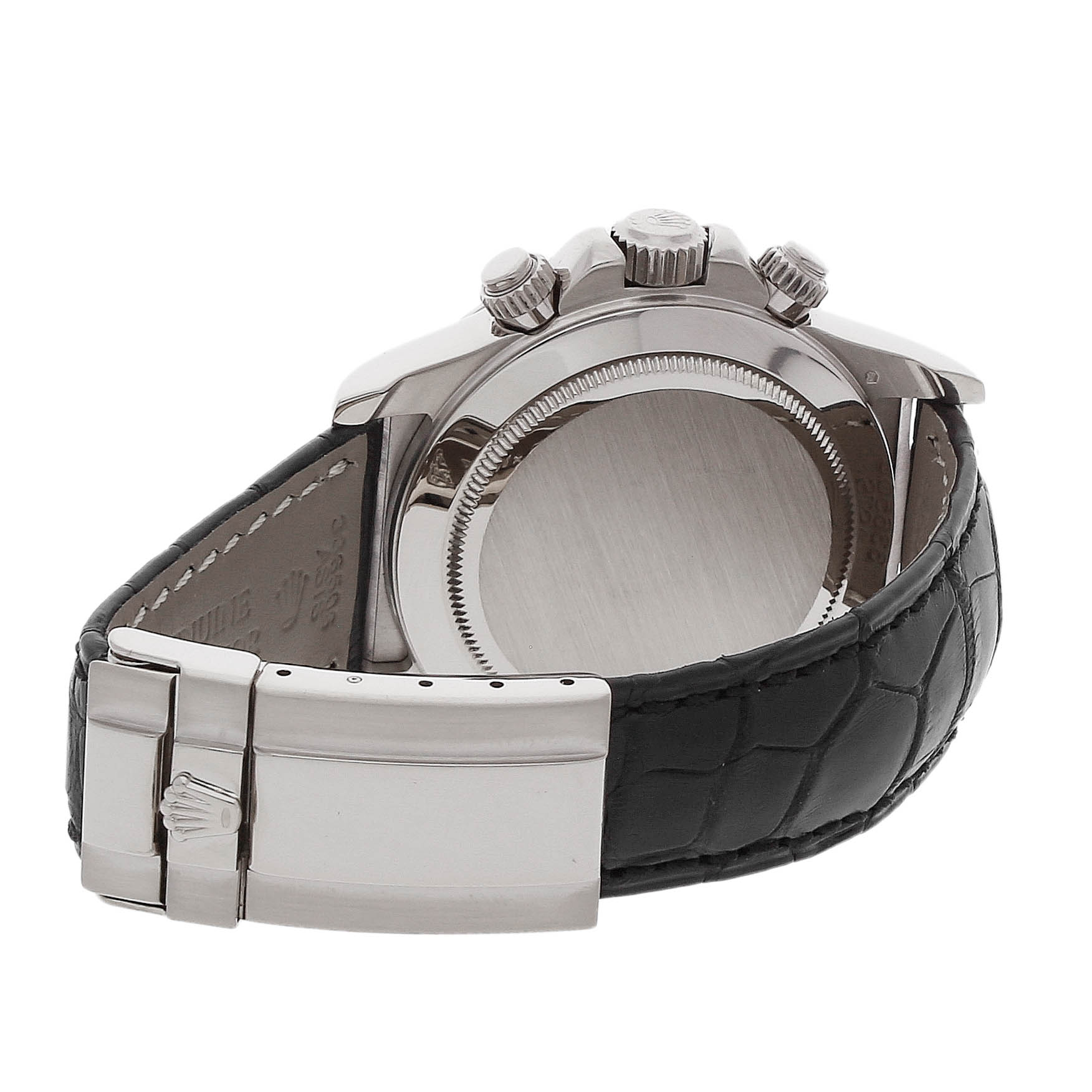 Pre-Owned Rolex Daytona Cosmograph (16519) self - winding automatic watch, features a 40mm 18k white gold case surrounding a pink mother-of-pearl diamond dial on a black alligator strap with an 18k white gold deployant buckle. Functions include hours, minutes, small seconds, chronograph and tachymeter. This watch has been serviced and does not come with box or papers. A Serial.Time remaining on the Manufacturer's service warranty!
