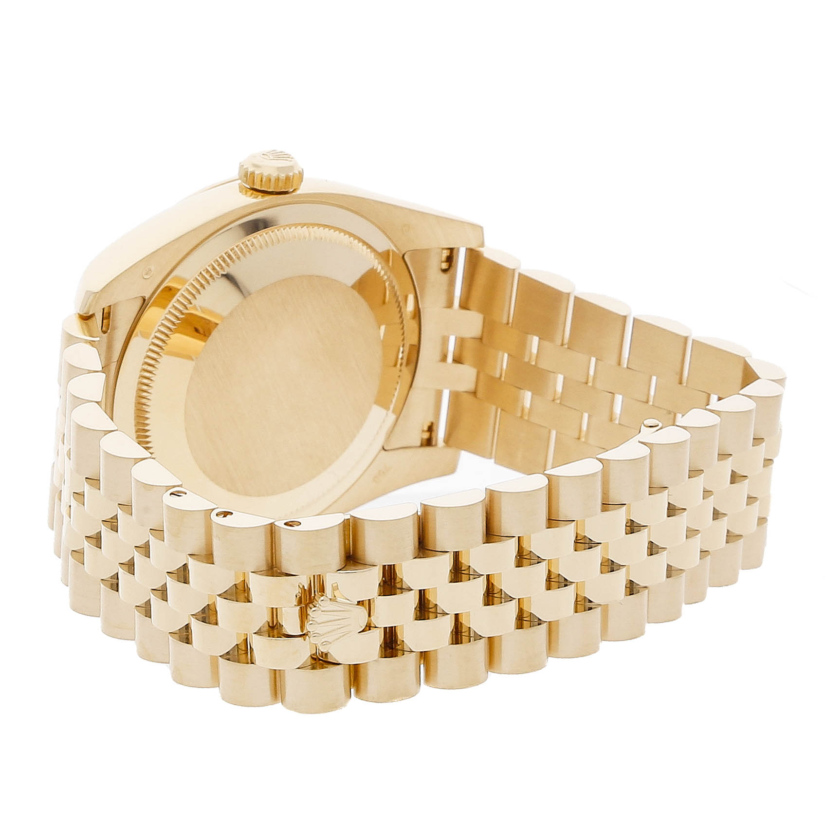 Pre-Owned Rolex Datejust (116208) self - winding automatic watch, features a 36mm 18k yellow gold case surrounding a black Jubilee dial on an 18k yellow gold Jubilee bracelet with folding buckle. Functions include hours, minutes, seconds and date.This watch does not come with box or papers. D Serial.We back this watch with a 2-Year WatchBox warranty!This watch will be ready to ship in 5-7 days!