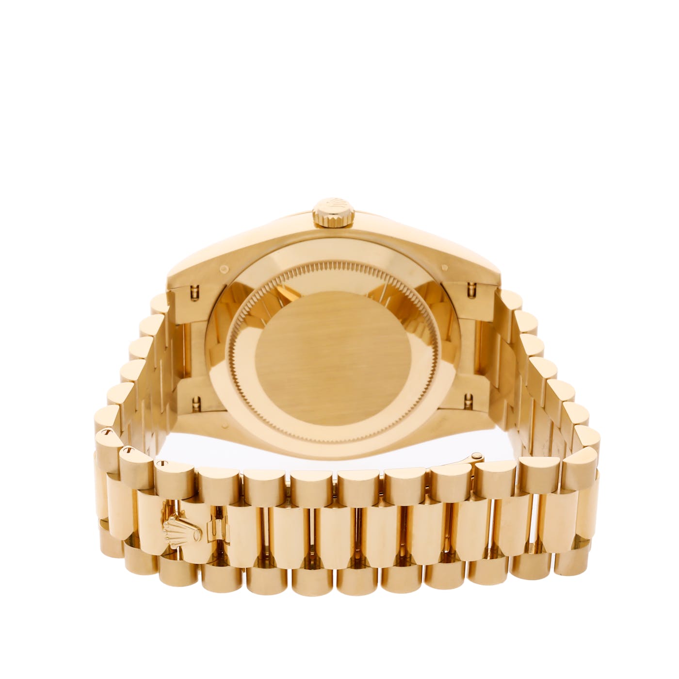 Pre-Owned Rolex Day-Date (228238) self - winding automatic watch, features a 40mm 18k yellow gold case surrounding a black dial on an 18k yellow gold President bracelet with folding buckle. Functions include hours, minutes, seconds, date and day. This watch comes complete with the original box and papers. Scattered Serial. Time remaining on the factory warranty!
