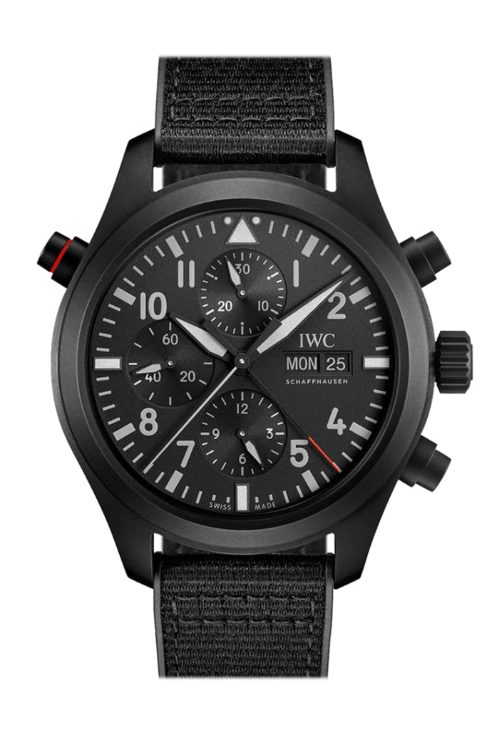 IWC Pilot DOUBLE Chronogragh Watch IW371815 Ceratanium® case, Automatic, self-winding, Diameter 44.0 mm, Black dial with luminescence, Green rubber strap with textile inlay, Strap width 21.0 mm. Made in Switzerland