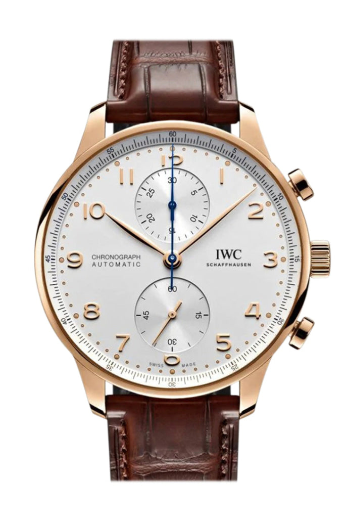 18kt rose gold case with a brown (alligator) leather strap. Fixed 18kt rose gold bezel. White dial with rose gold-tone leaf-style shape hands and Arabic numeral hour markers. Minute markers around the outer rim. Dial Type: Analog. Chronograph - two sub-dials displaying: 60 second and 30 minute. IWC calibre 69355 automatic movement, based upon IWC 69370, containing 27 Jewels, composed of 194 parts, bitting at 28800 vph, and has a power reserve of approximately 46 hours. Scratch resistant sapphire crystal. Pull / push crown. Transparent case back. Round case shape. Case size: 41 mm. Case thickness: 13.1 mm. Band width: 20 mm. Tang clasp. Water resistant at 30 meters / 100 feet. Functions: chronograph, column wheel, hour, minute, small second. Portugieser Series. Luxury watch style. Watch label: Swiss Made. IWC Portugieser Chronograph Automatic White Dial 18kt Rose Gold Men's WatchIW371611