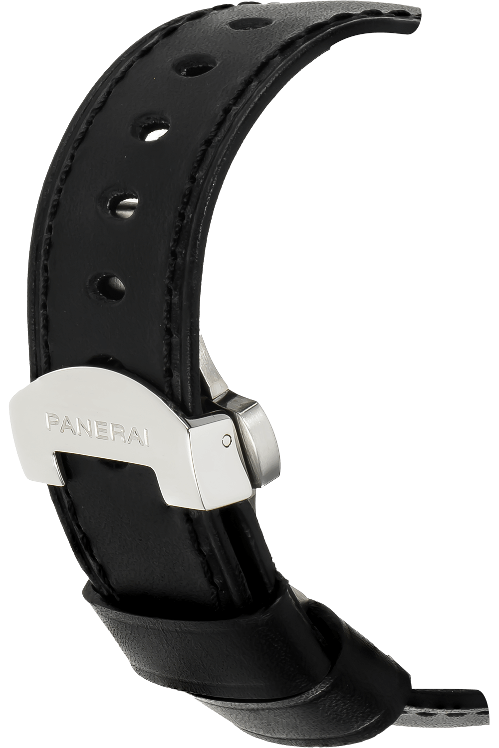 Stainless steel case with a black leather strap. Fixed stainless steel bezel. White dial with luminous black hands and Arabic numeral hour markers. Minute markers around the outer rim. Dial Type: Analog. Luminescent hands and markers. Panerai calibre P.5000 hand wind movement with a 192-hour / 8-day power reserve. Scratch resistant anti-reflective sapphire crystal. Screw down crown. Transparent sapphire case back. Case size: 44 mm. Case thickness: 13 mm. Round case shape. Band width: 22.9 mm. Band length: 9 inches. Tang clasp. Water resistant at 300 meters / 1000 feet. Functions: hour, minute. Luxury watch style. Watch label: Swiss Made. Panerai Luminor Base 8 Days Acciaio Mechanical Mens Watch PAM00561