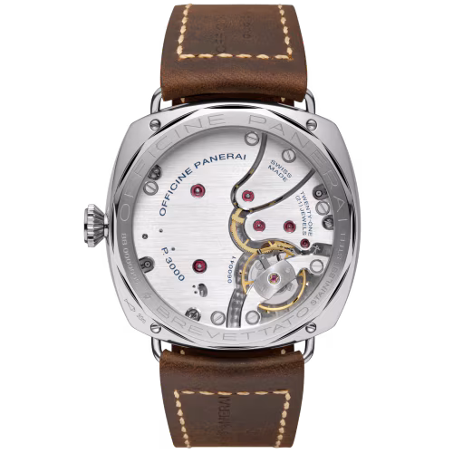 Silver-tone stainless steel case with a dark brown leather strap. Fixed silver-tone stainless steel bezel. Black dial with index-Arabic numerals hour markers. Dial Type: Analog. Panerai Calibre P.3000 hand wind movement with a 3-day power reserve. Scratch resistant sapphire crystal. Transparent case back. Case size: 47 mm. Cushion case shape. Band width: 22 mm. Water resistant at 30 meters / 100 feet. Functions: hour, minute. Additional Info: limited edition of 1000 pieces. Luxury watch style. Watch label: Swiss Made. Panerai Radiomir Black Dial Mens Limited Editon Hand Wound Watch PAM00685
