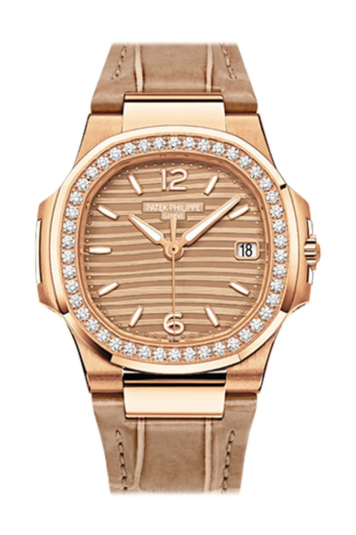 18kt rose gold case with a beige leather strap. Fixed 18kt rose gold diamond-set bezel. Gold-tone dial with rose gold-tone hands and index hour markers. Arabic numerals mark the 6 and 12 o'clock positions. Dial Type: Analog. Date display at the 3 o'clock position. E23-250 S C quartz movement. Scratch resistant sapphire crystal. Solid case back. Case size: 32 mm. Cushion case shape. Fold over clasp. Water resistant at 60 meters / 200 feet. Functions: date, hour, minute, second. Luxury watch style. Watch label: Swiss Made. Patek Philippe Nautilus 18K Rose Gold Diamond Ladies Watch 7010R-012 7010R