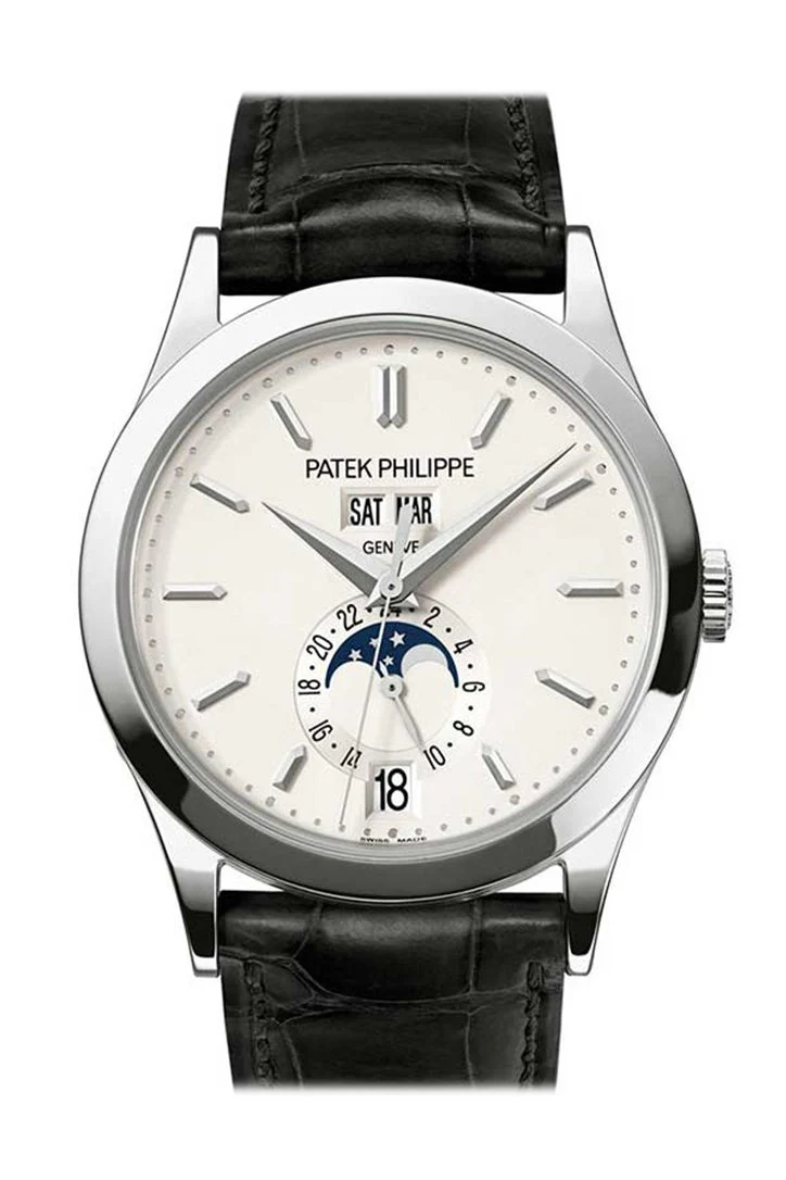 18kt white gold case with a black leather strap. Fixed 18kt white gold bezel. Silvery opaline dial with silver-tone hands and index hour markers. Minute markers around the outer rim. Dial Type: Analog. Date display at the 6 o'clock position. Month and day of the week displayed below the 12 o'clock position. Moonphase display at the 6 o'clock position. Automatic movement with a 45 hour power reserve. Scratch resistant sapphire crystal. Pull / push crown. Skeleton case back. Case diameter: 38 mm. Round case shape. Band width: 20.3 mm. Band length: 8 inches. Deployment clasp. Water resistant at 30 meters / 100 feet. Functions: month, date, day, hour, minute, second, moon phase. Casual watch style. Watch label: Swiss Made. Patek Philippe Grand Complications Silvery Opaline Mens Watch 5396G-011