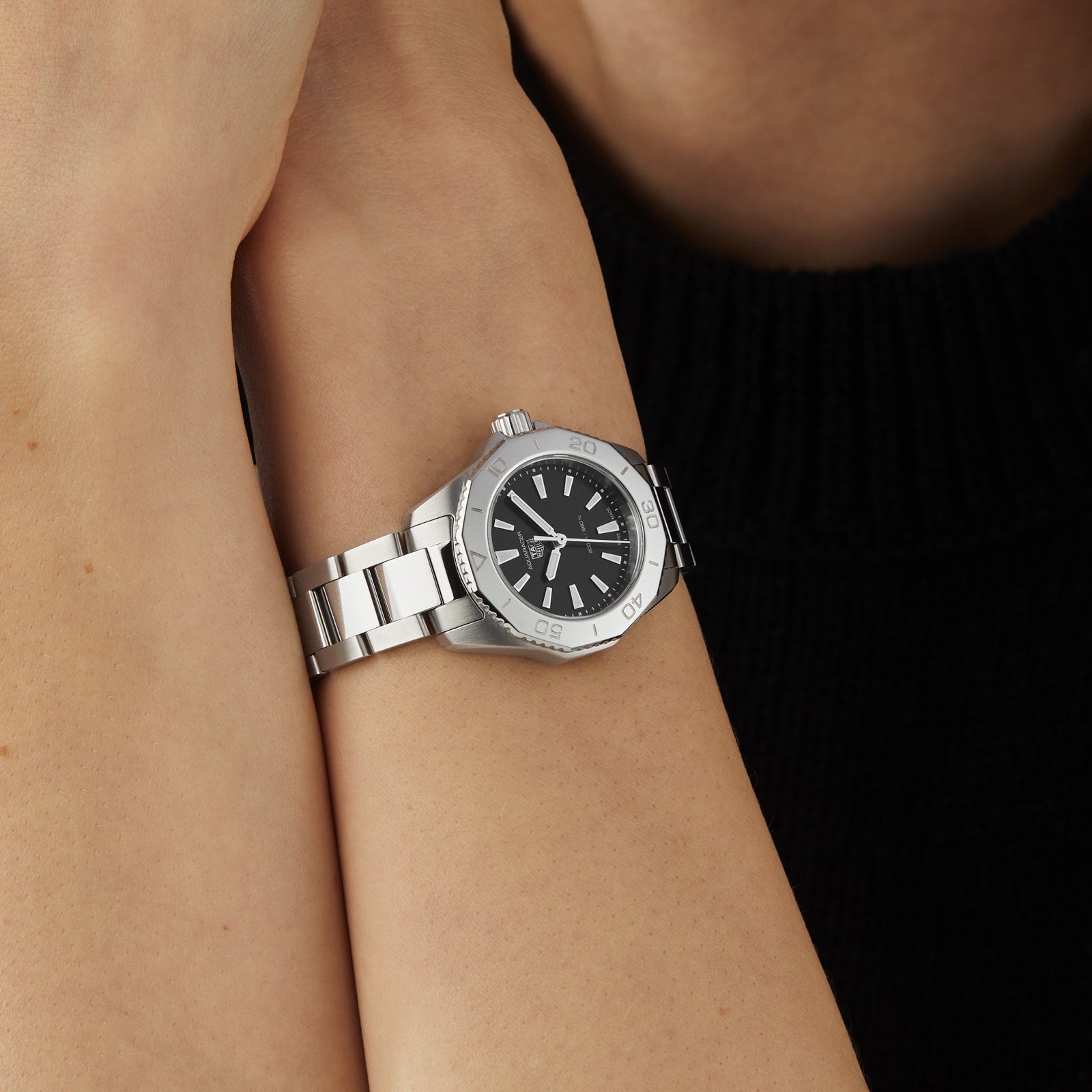 Aquaracer – pushing limits in search of greater performance Robust construction and bold design Refined 30mm stainless steel case with a co-ordinating bracelet Black sunray brushed dial with rhodium-plated hour markers Powered by a reliable Quartz movement RELIABLE AND BOLD Re-launched in 2021, the Aquaracer collection has re-written sports watch design and performance codes to take wearers beyond the edge as they push their limits in search of ever-greater performance. The Aquaracer Professional 200 collection unites robust construction with boldness of design. Designed to go anywhere in style, the 30mm stainless steel case embraces refined ergonomics and finishes, while the black sunray brushed dial makes a stylish statement. PERFECT FUNCTIONALITY This charming 30mm model pairs a stainless steel case with a co-ordinating steel bracelet. Rhodium-plated hands and hour markers create a stark contrast against the black sunray brushed dial, filled with Super-LumiNova for enhanced visibility, day and night. Precision and reliability are provided by Quartz movement, while water resistance to 20 bar (200 metres) improves performance.