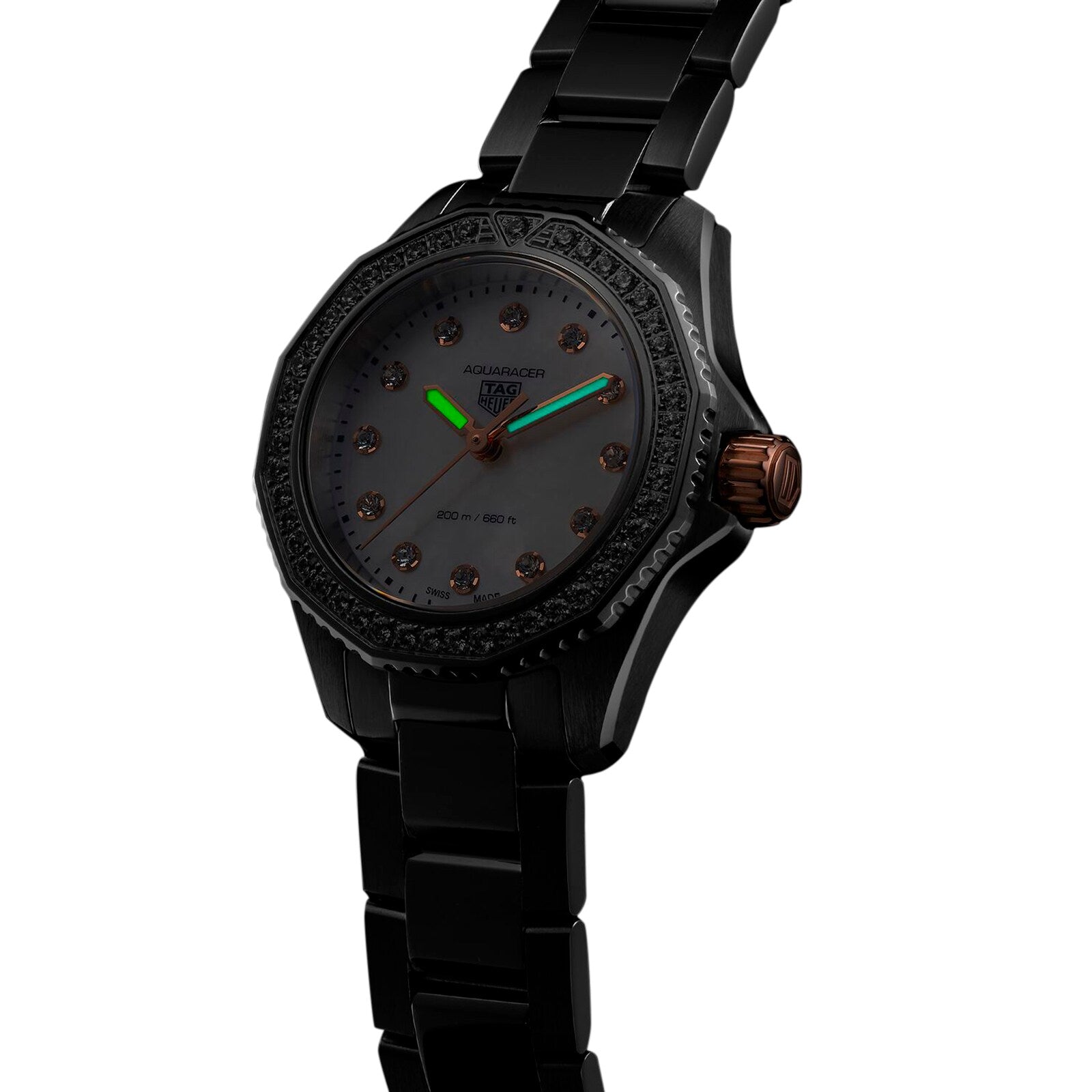 Aquaracer – pushing limits in search of greater performance Designed to take on any challenge with absolute sophistication Presented in a 30mm fine-brushed and polished steel case with optimal ergonomics and finishing White mother-of-pearl dial with 12 dazzling diamonds, framed by a diamond-set bezel Powered by a reliable quartz movement ABSOLUTE SOPHISTICATION Re-launched in 2021, the Aquaracer collection has re-written sports watch design and performance codes to take wearers beyond the edge as they push their limits in search of ever-greater performance. The Aquaracer Professional 200 collection raises the bar for versatility. Bringing together inspired performance and exceptional style, this Professional 200 Date model is characterised by its shimming white mother-of-pearl dial and glistening diamond accents. DAZZLING DIAMONDS AND BRIGHT WHITE MOTHER-OF-PEARL This delicately crafted, 30mm model pairs a comfortable, fine-brushed and polished steel case with a co-ordinating thin, tapered stainless steel bracelet featuring a comfort extension link. The white mother-of-pearl dial enjoys added radiance courtesy of 12 dazzling diamond hour markers, while the bezel features a further 36 diamonds. This timepiece is water resistant to 20 bar (200 metres).