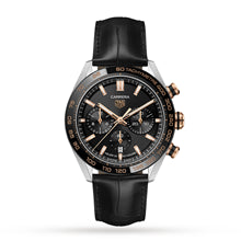 Carrera – embracing the spirt of endurance A distinct sense of style with a prestigious motor-racing heritage 44mm steel case with a black alligator leather strap and elegant black ceramic bezel Black brushed dial enhanced by 18K 5N rose gold details Driven by the calibre 02 automatic movement for exceptional reliability A NEW CLASSIC Born on the racetracks in 1963, the Carrera collection embraces the spirit of endurance and outstanding performance. Designed for professional drivers, yet with an elegant sense of style, the collection pays tribute to the infamous Carrera Panamericana race. A sports watch more than equipped to keep pace with high achievers, this TAG Heuer Carrera 02 model offers all the prestige of its motor-racing heritage. Driven by the Heuer 02 calibre automatic movement, this sophisticated timepiece boasts a distinct sense of style, with a captivating black and rose gold silhouette. STANDOUT STYLE This 44mm model pairs a brushed and polished steel case with a classic black alligator leather strap and 18K 5N rose gold crowns and push-pieces. Protected by a bevelled sapphire crystal dome, the sophisticated black dial optimises readability, with three chronograph counters, a date display, and rose gold indexes and hands filled with white Super-LumiNova® for incredible visibility in all conditions. The screw-down sapphire case back reveals the 02 calibre movement at work, while an 80- hour power reserve ensures impeccable performance.