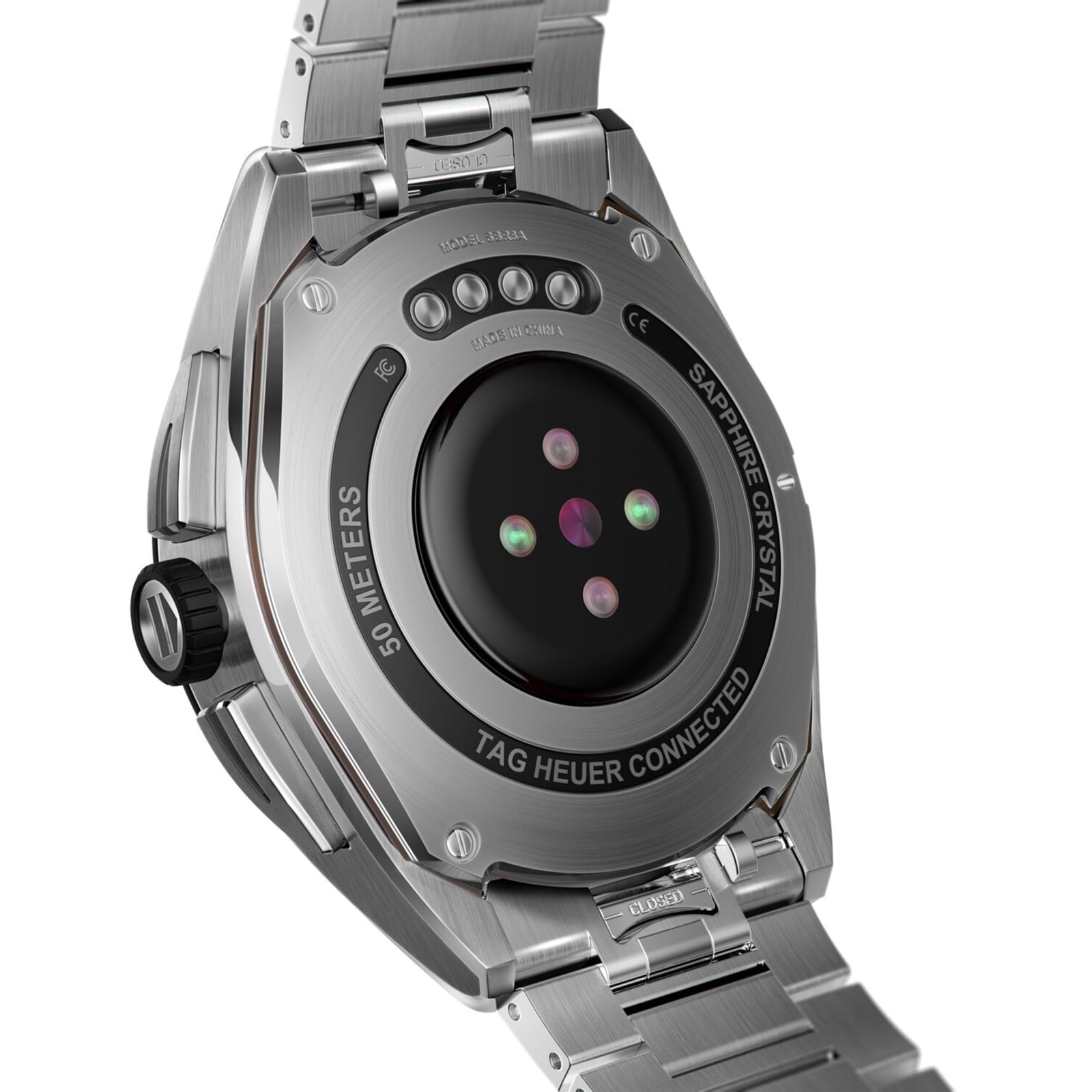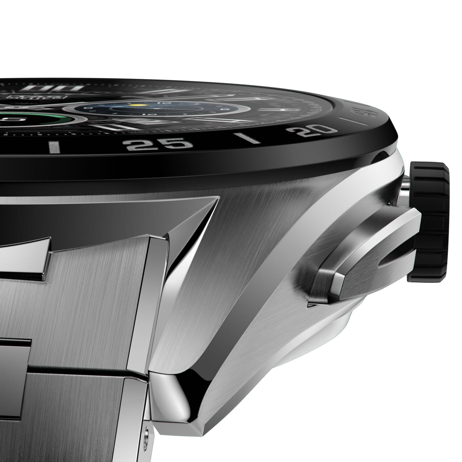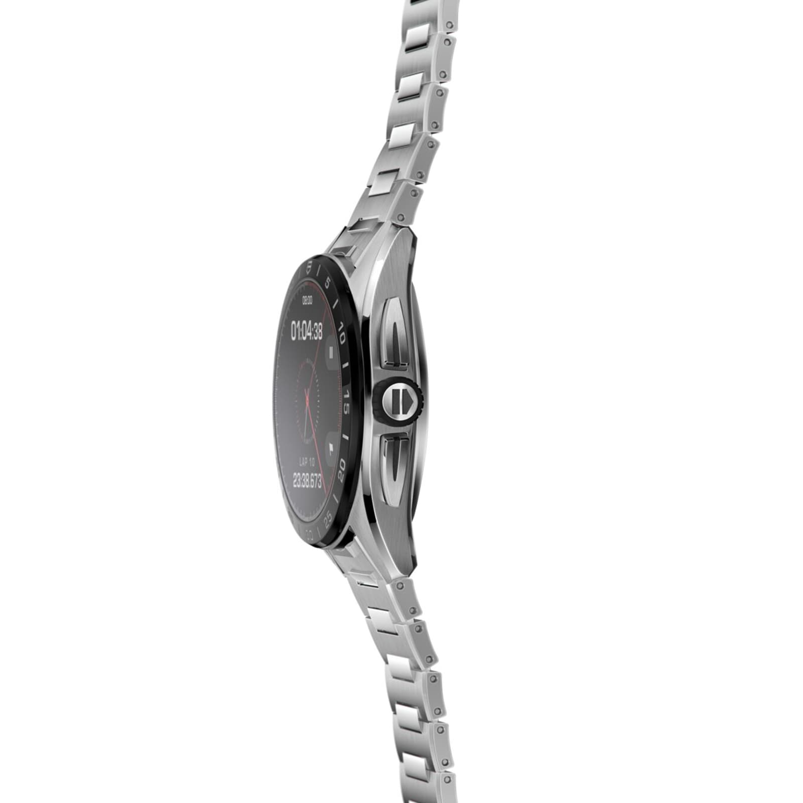 Connected Calibre E4 – luxury meets performance Large high-tech screen framed by a black ceramic bezel Seamless steel H-shape bracelet optimised for comfort Elegant 45mm steel case with sharp and sporty lugs Featuring the TAG Heuer sports exclusive application THE NEXT GENERATION OF TIMEKEEPING Bringing together avant-garde design and cutting edge technology, the Connected Calibre E4 collection delivers peak performance and unmatched elegance. Finding the perfect balance between innovation and high end watchmaking, this Connected model allows you to do everything from track your workout to display your virtual artwork, and everything in between. SUPERIOR ERGONOMICS This 45mm model pairs a steel case with a seamless steel H-shape bracelet, which is fully interchangeable so that you can match your watch to your mood. Resistant to wear and aging, the large, high-tech touch screen is framed by a black ceramic bezel and protected by sapphire crystal. Powered by Wear OS by Google, this state-of-the-art smart watch offers extensive functionality, including a heart rate monitor, compass, microphone, and accelerometer, as well as pre- installed apps, such as TAG Heuer Wellness. The TAG Heuer sports exclusive application offers the functionality needed to take on any challenge and can be personalised to your goals. Or, if you’re more interested in NFTs, you can transfer your favourite NFTs to your new Lens watch face and display your collectible virtual artworks on your wrist.