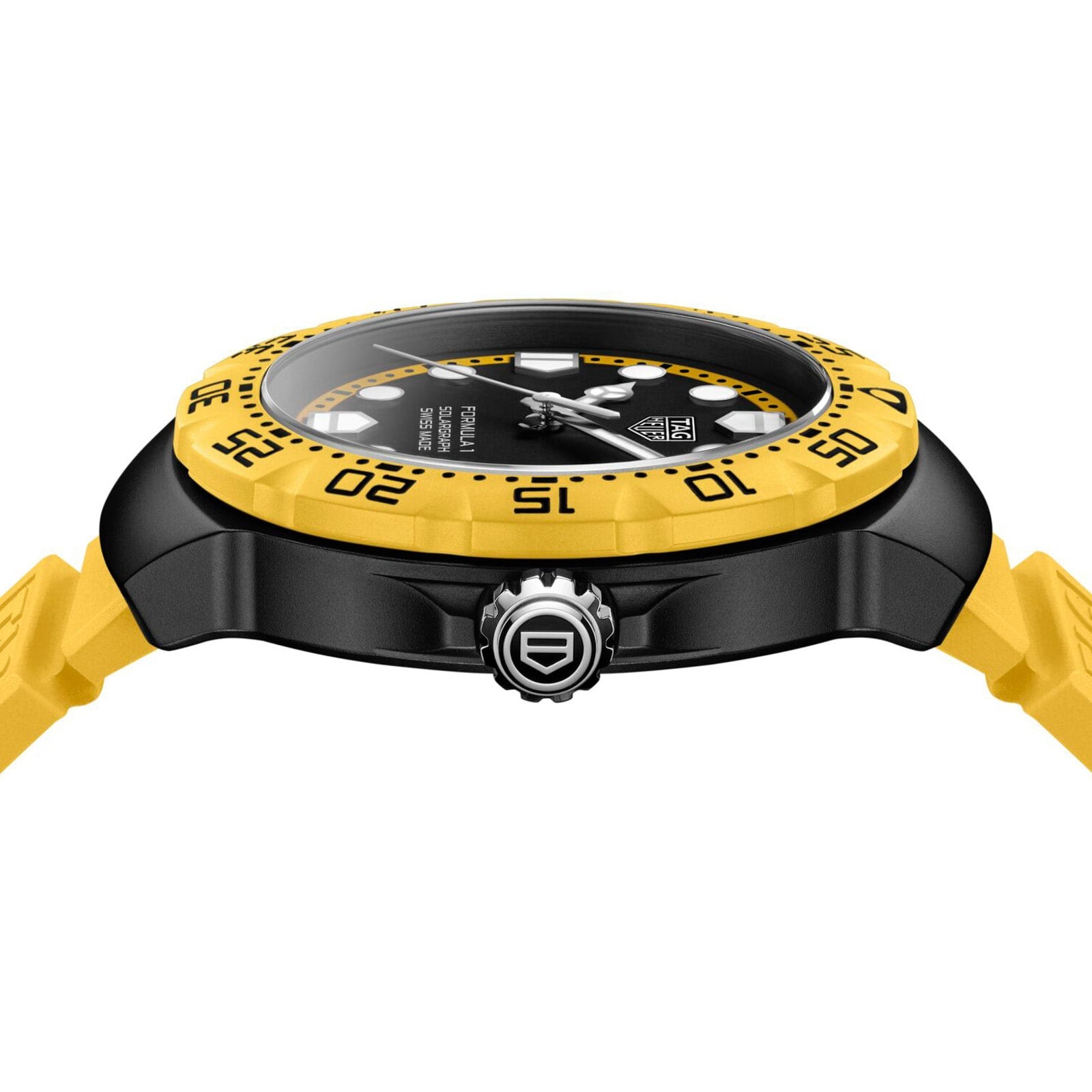 The TAG Heuer Formula 1 Solargraph (38mm) pairs a black DLC case with bold yellow accents, driven by the solar-powered Calibre TH50- 00 movement. Featuring a yellow rubber strap and TH-Polylight bezel, it offers effortless performance and bold style for modern wearers.