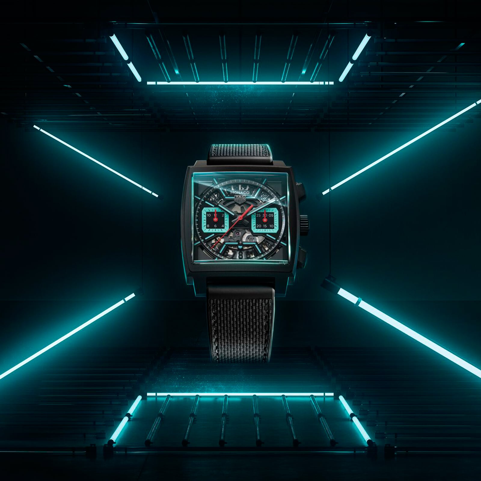 Monaco Chronograph - superbly avant-garde Made for those with a rebellious spirit 39mm square titanium case with a versatile rubber and leather strap Sandblasted black skeletonised dial with turquoise chronograph complications Powered by the calibre Heuer 02 automatic movement A REBELLIOUS SPIRIT Dynamic, bold and daringly avant-garde, the Monaco Chronograph is unapologetic in its show- stopping design and extreme precision. Boasting a fearless square silhouette, this timepiece pairs robust materials with vivid splashes of colour for a design that exudes the definition of cool. Featuring a skeletonised dial for a vivid look at the powerful inner workings, this handsome timepiece is an ideal addition to the bravest of accessory collections. FOR THE BRAVE This 39mm model is presented in a square-shaped black DLC-coated titanium grade 2 case, secured by a versatile black calf leather and rubber strap. The skeletonised black sandblasted dial is home to two chronograph complications, highlighted by luminous turquoise outer edges and vivid red lacquered hands. Driven by the calibre Heuer 02 automatic movement, this timepiece is water resistant up to 10 bar (100 metres) and also features an 80-hour power reserve.