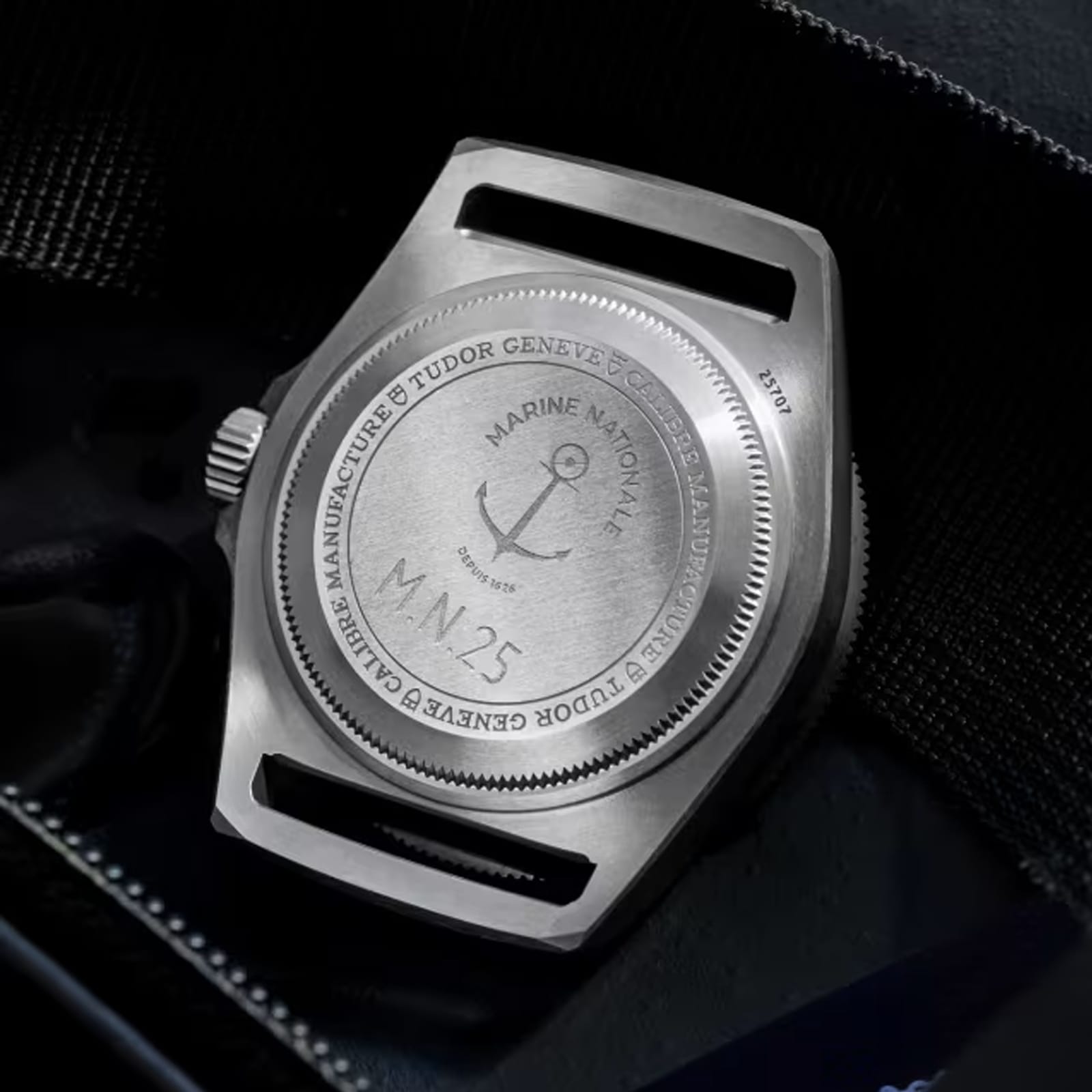 Developed in conjunction with the French Navy's combat swimmers, the Pelagos FXD model is based on a set of specifications that are as precise as they are demanding. For this reason, it includes many functional features that are new to TUDOR, such as its fixed strap bars that are machined into the main body of the 42 mm titanium case for increased robustness and reliability. Five-year Guarantee Five-year transferable guarantee with no registration or periodic maintenance checks required Case Titanium case, 42mm in diameter, 12.75mm thick, 52mm from lug to lug, satin-brushed finish Fixed bracelet bars Steel case back Lugs: 22mm lug width Case thickness: 12.8mm Movement Manufacture Calibre MT5602 (COSC) Self-winding mechanical movement with bidirectional rotor system Power Reserve Power reserve of approximately 70 hours Winding Crown Titanium crown, adorned with the TUDOR shield in relief Waterproofness Waterproof to 200m (660 ft) Bezel Bidirectional rotating bezel in titanium with ceramic disc, 60-minute retrograde graduation for navigation by successive stages Dial Navy blue Crystal Sapphire crystal Bracelet Navy blue fabric strap with grey central thread, equipped with a self-gripping fastening system Complimentary navy blue rubber strap with woven motif and titanium buckle, included in the box